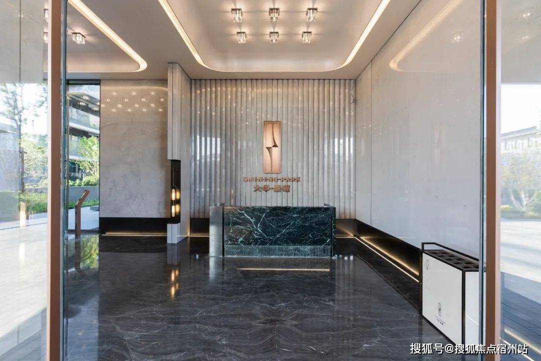 爱马仕灰大理石,顶部水晶灯和墙面壁灯均为全铜打造,大堂接待台采用产自意大利山脉的普拉达绿奢石一体打造而成。
