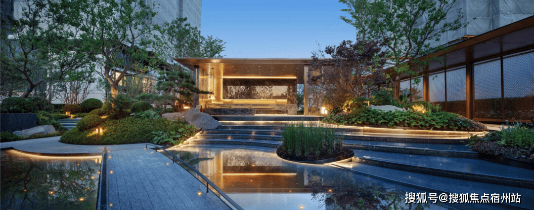 树池,还在水景底部铺了数百片蓝钻瓷片,全角度弧形定制,水刀切割,用金属线条勾勒出水波的形状。